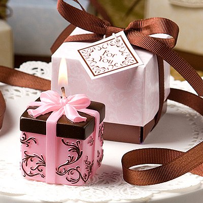 This attractive brown and pink Gift Box Collection box candle favor makes a gift that's destined to light up your guests' day Talk about a gift that keeps on giving! This little gift box candle is one hot item and it's sure to add a classy and memorable touch to your day. Sold only by Fashioncraft, each Gift Box Collection scented candle favor measures 1 ¾" tall x 1 ½" wide and remarkably resembles an exquisitely wrapped gift in a classic pink and brown damask design with a solid brown lid, finished with a pink ribbon wrap and bow centered at its top. An elegant present that makes a great addition to any festive occasion, each gift box candle favor comes beautifully packaged in a two piece box with a pink and white damask design top and chocolate brown base, wrapped and tied with a brown satin ribbon and an attached matching design "For You" tag.