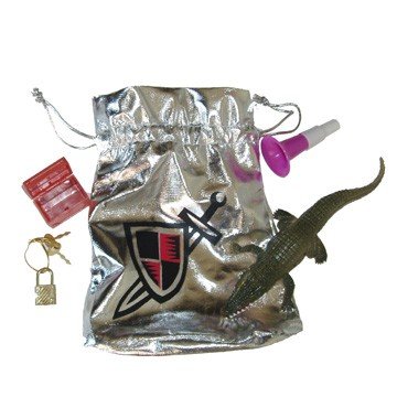 Item Number: 41307 Share our new knight favor bags with party guests. Each silver metallic bag is printed with a sword and shield motif. Includes plastic toy alligator, toy horn, lock and key set and toy treasure chest. Made in China. Age 3+