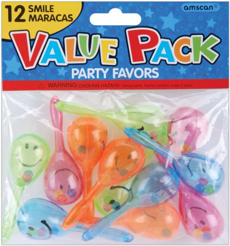 Smile maraca party favors. Includes 12 per package. Three of each color: orange pink green and blue. Warning: choking hazard-small parts. Not for children under 3 years.