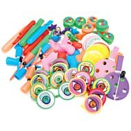 Assortment contains 6 each of 8 different favors, including plastic squirt guns, tops, glasses, mazes, plastic yo-yos, paddle ball, bazooka, and container with string attached to ball (game). Colors: red, orange, yellow, green, blue, and pink. Warning: choking hazard-small parts. Not for children under 3 years.