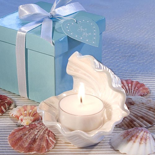 Give your guests a chance to go beachcombing without ever leaving their tables with these exceptional shell design candle favors Just like a real oyster shell, this exquisite open shell design favor has a treasure inside. But, here the treasure is a lovely tea light candle ready to glow. Each shell candle favor measures 3" x 3" and is made with an iridescent white ceramic classic open oyster shell shape with a clear glass candle holder and poured white candle resting inside. Each elegant shell design candle favor comes stunningly packaged in an aqua blue box tied with a white satin bow and an attached matching heart shaped "For You" tag.