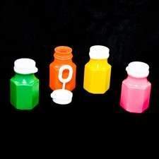 Plastic bottle with wand attached to lid. Asst colors of bottles. Excellent size for giveaway! Popular item at children's parties.